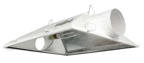 Massive size for increased coverage area and excellent uniformity. Allows closer placement to plants. Includes tempered glass, removable frame, built-in socket and 15 ft lamp cord. Completely sealed—features gasketed glass (between glass and reflector and glass and frame) and hinged frame to hold glass tightly in place. Powder-coated galvanized steel body. Highly reflective aluminum interior offers excellent reflectivity and diffusion. Swing Stop® retention cable keeps glass from abruptly swinging down. Captured thumb screws and closure mechanism for ease of use and excellent sealing. Air-cooling flanges have a bead ring to keep ducting securely in place. US Patent: D698,628.