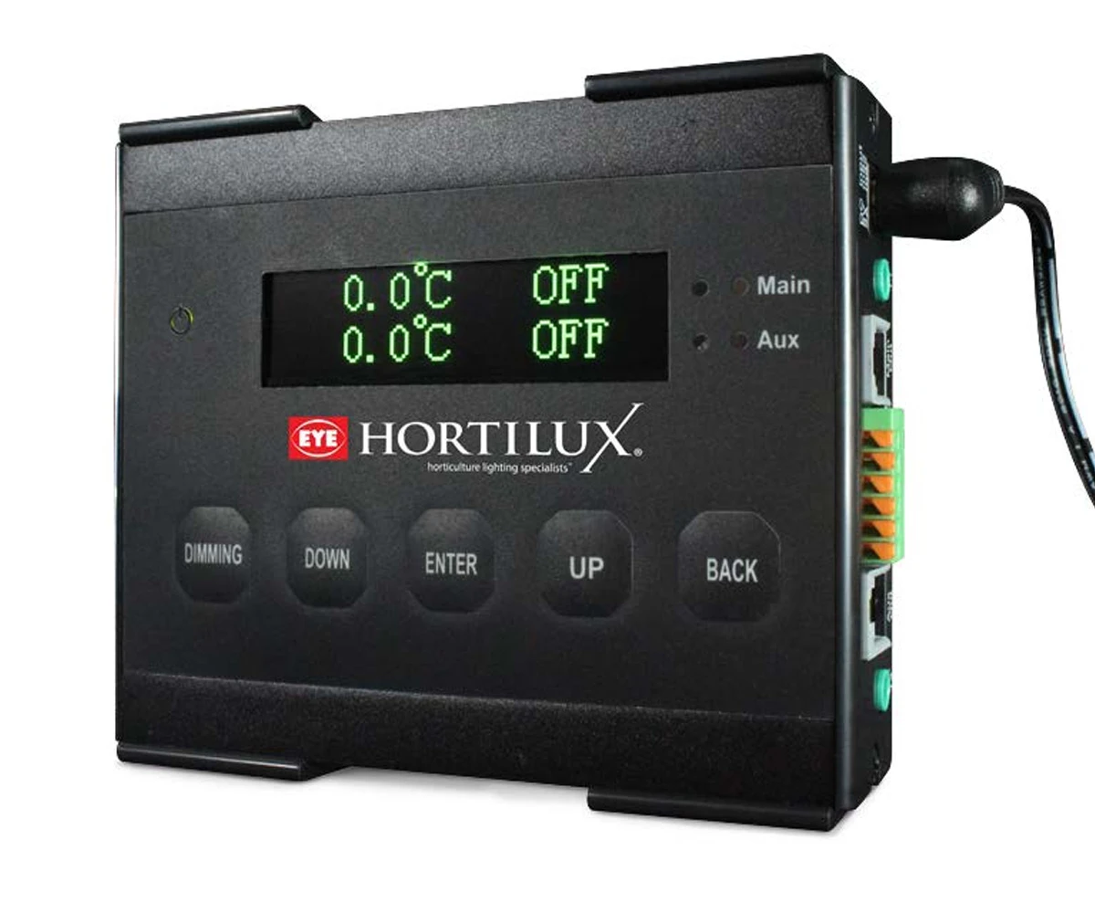 Using the EYE HORTILUX® GRC1 Master Controller for your EYE HORTILUX® DE 1000-VS offers you maximum control, ease of use, safety and plug-and-play installation. The GRC1 controller can switch all the interconnected systems on and off with its internal timer, adjust them to your required output level (in percentage or exact output power) and even simulate sunrise and sunset to gradually adjust the climate in your grow room when your lights go on or off. You can connect up to one-hundred systems to one controller and control two separate rooms or two accessories such as a humidifier and air conditioning.